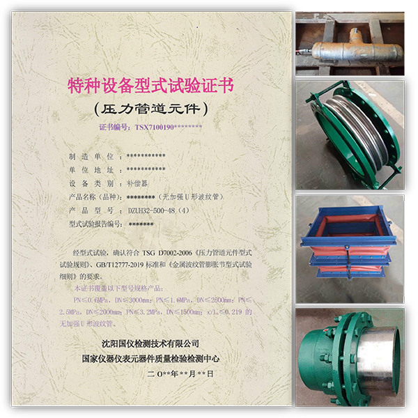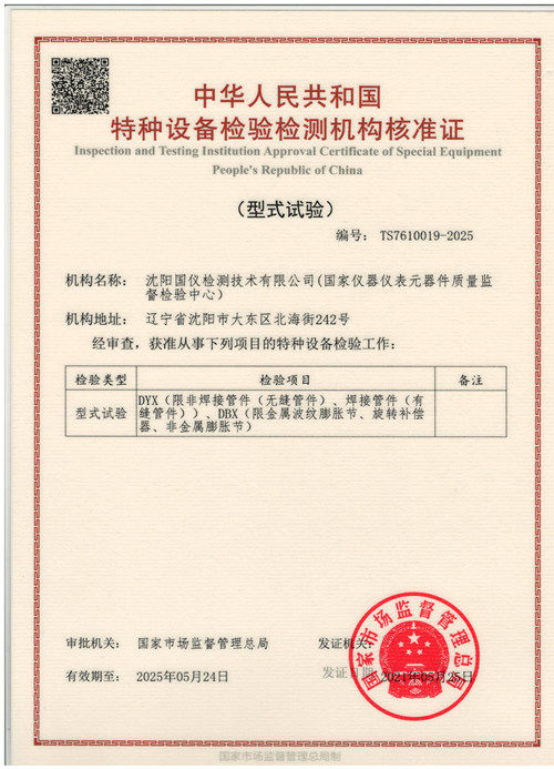 經(jīng)國(guó)家市場(chǎng)監(jiān)督管理總局審查,獲準(zhǔn)從事DYX(限非焊接管件(無縫管件)、焊接管件(有縫管件))、DBX(限金屬波紋膨脹節(jié)、旋轉(zhuǎn)補(bǔ)償器、非金屬膨脹節(jié))特種設(shè)備型式試驗(yàn)檢驗(yàn)工作。